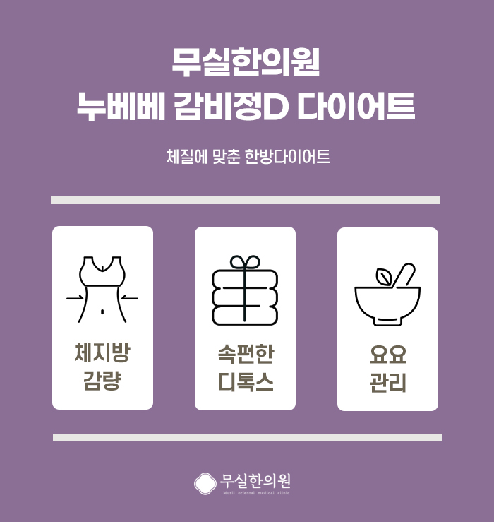 누베베 감비정D 다이어트 한약은 약을 복용하시는 동안 오히려 규칙적인 식사가 중요합니다. 알약의 형태로 되어 있어 편리하게 복용이 가능하며, 감량 위한 핵심 성분을 정량화한 기술로 안정적으로 복용이 가능합니다. 감사합니다.