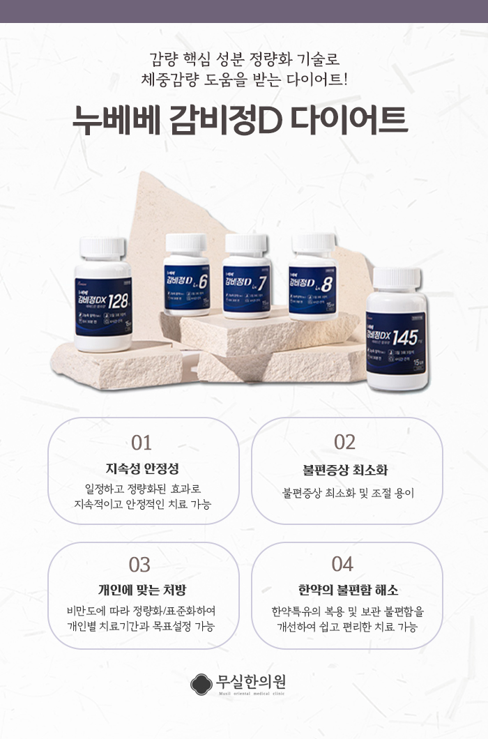 누베베 감비정D 다이어트 한약은 알약 형태의 한약으로 1정에 다이어트 감량 핵심 성분을 일정하게 유지합니다. 마황 함유량 역시 미국 FDA 및 국내 식약처의 의약품 허용량 기준범위 내에서 처방하고 있는 무실동다이어트약입니다.